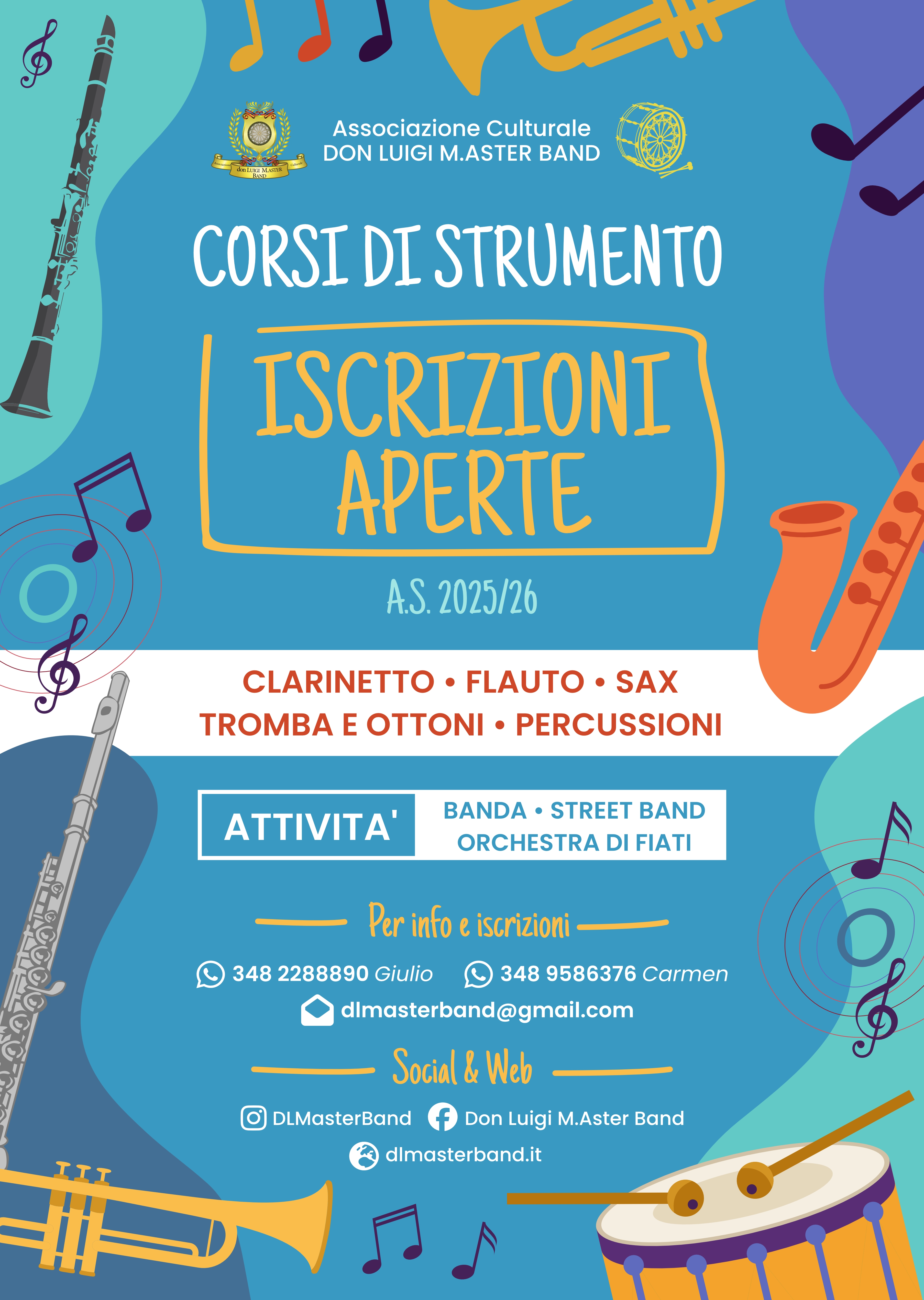 💥 Da ottobre tornano i corsi di Clarinetto, Flauto traverso, Sassofono, Tromba e Ottoni, Percussioni e Batteria, aperti a bambini, ragazzi e adulti.